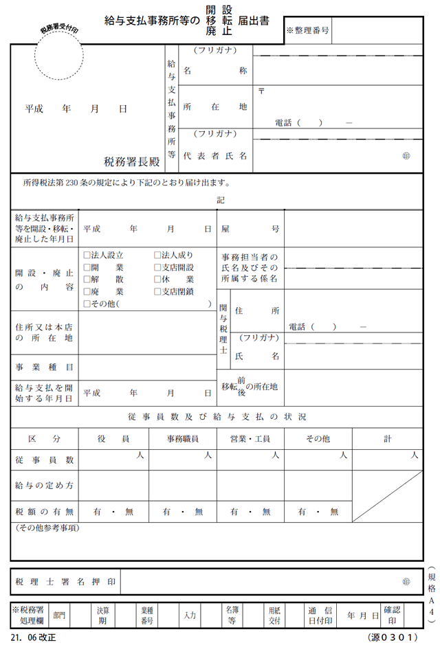 給与の支払者が、国内において給与等の支払事務を取り扱う事務所等を開設した場合に、その旨を所轄税務署長に対して届け出る手続です。