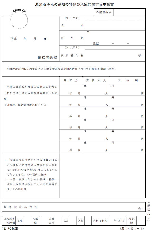 ⑥ 源泉所得税の納期の特例の承認に関する申請書